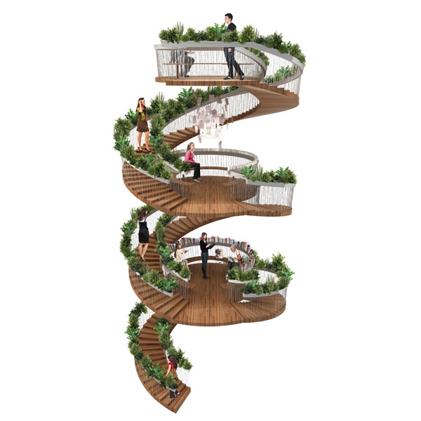 樓梯不僅僅是個(gè)過(guò)渡區(qū)域,還可以兼?zhèn)淦渌δ?,比如空中花園。在倫敦的一處辦公區(qū)域里,設(shè)計(jì)師把承重柱在中間的傳統(tǒng)樓梯變成螺旋結(jié)構(gòu)的The Living Staircase,沿著欄桿種滿植物,還設(shè)有圓形平臺(tái),成為可以讓上班族在此休息放松的公共區(qū)域。設(shè)計(jì)源自 Paul Cocksedge Studio。