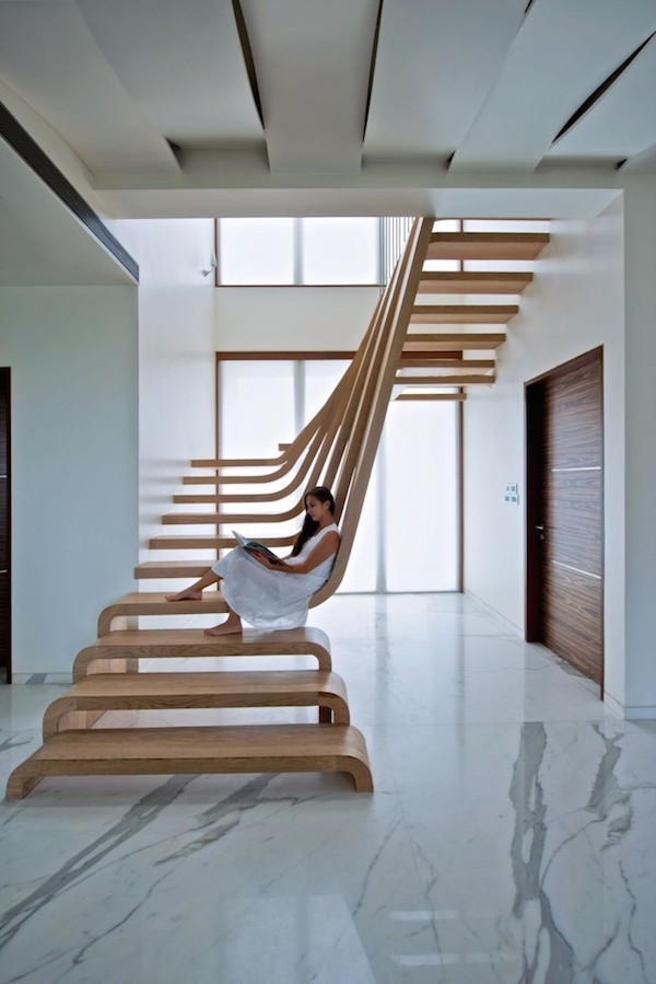 建筑師工作室Arquitectura en Movimento Workshop設(shè)計(jì)的樓梯,美輪美奐,少了扶手,卻多了連接上下梯面的木板,爬起來舒服,看起來也順眼,而且室內(nèi)的透光性更好,使用者可以隨意的坐在樓梯上,并且以延伸面做為椅背,圓弧的角度看起來十分舒適。