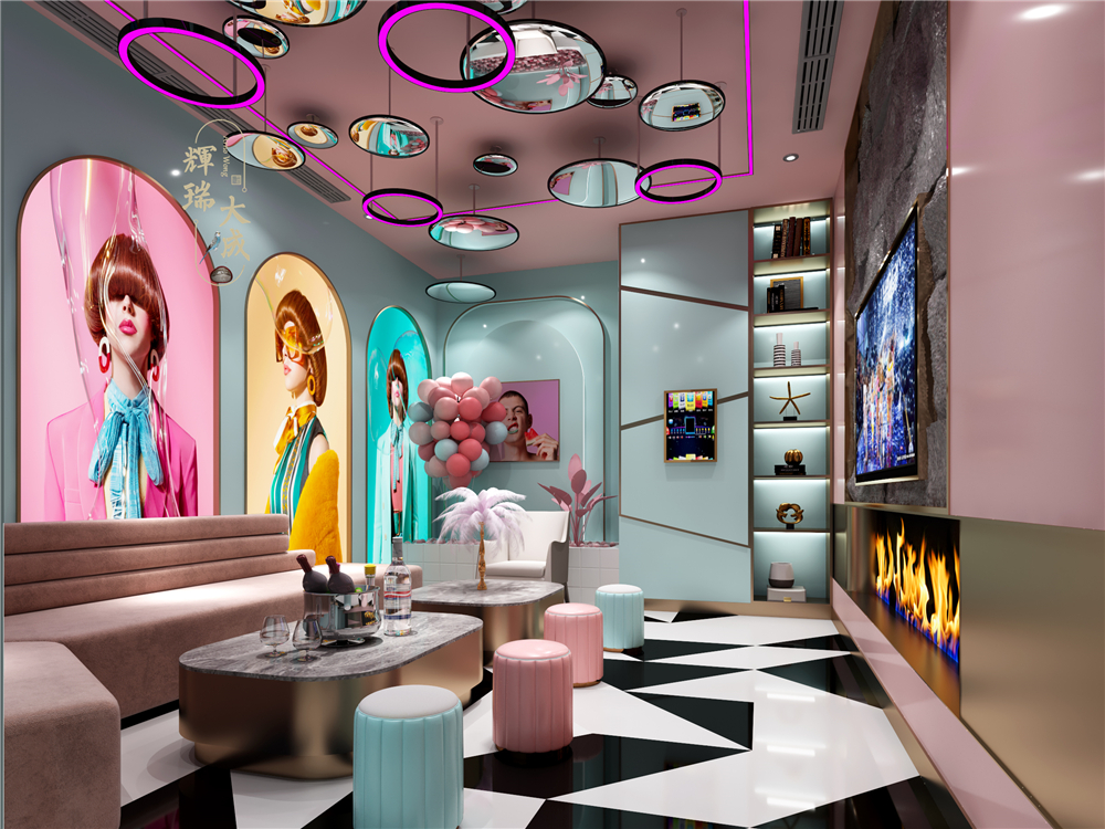 對于這個包房來說,頂面墻面并沒有太多的硬裝修,但整體效果卻是奪人眼球的,色彩和畫面感豐富,很有逼格,色彩的飽和度和配合都顯出設(shè)計師的水平,而這些壁畫也是KTV設(shè)計師歷經(jīng)多年的審美效果,隨時保持對設(shè)計的好奇和創(chuàng)新,時常國內(nèi)外深造,提高自己的能力和設(shè)計眼界,才會做出更好的KTV設(shè)計效果。