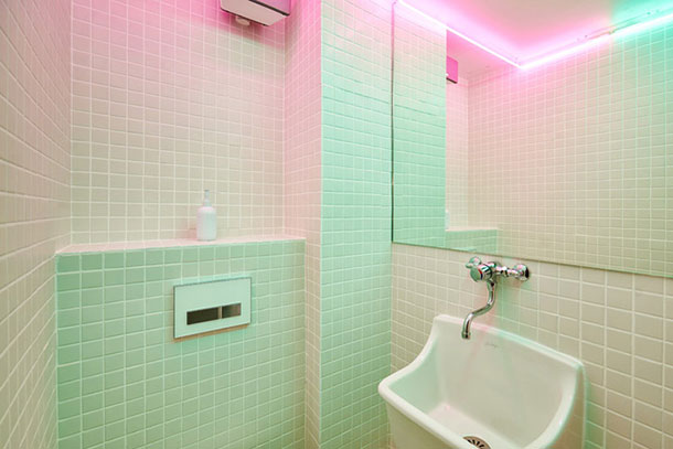 洗手間的墻面設(shè)計,雖然只是普通的墻面貼瓷處理,卻因為雙色霓虹燈帶來的燈光效果以及鏡面的作用下,不僅與前廳的霓虹燈燈管與金屬管網(wǎng)的風格搭配,這個空間也再次帶給人超現(xiàn)實的趣味,不僅如此,這個獨特的空間布置吸引大量的顧客自拍,甚至在instagram上都有專屬這個廁所關(guān)鍵詞的自拍照片#pee_n_why !